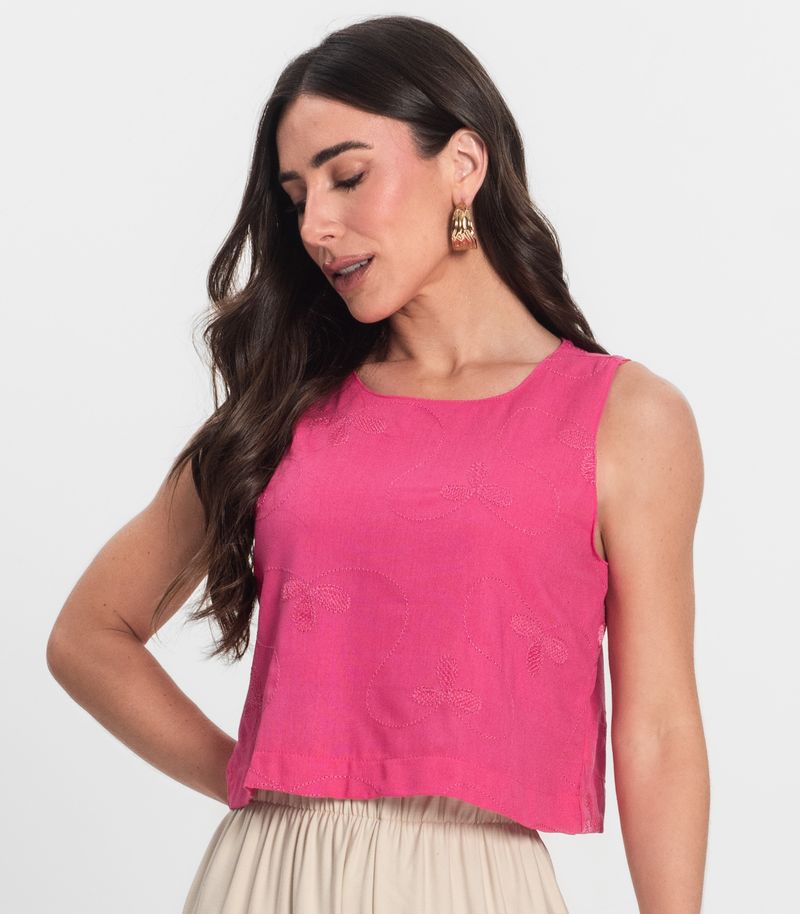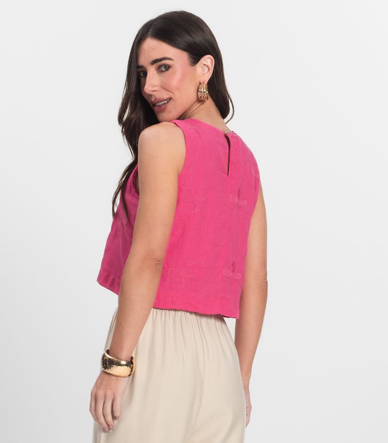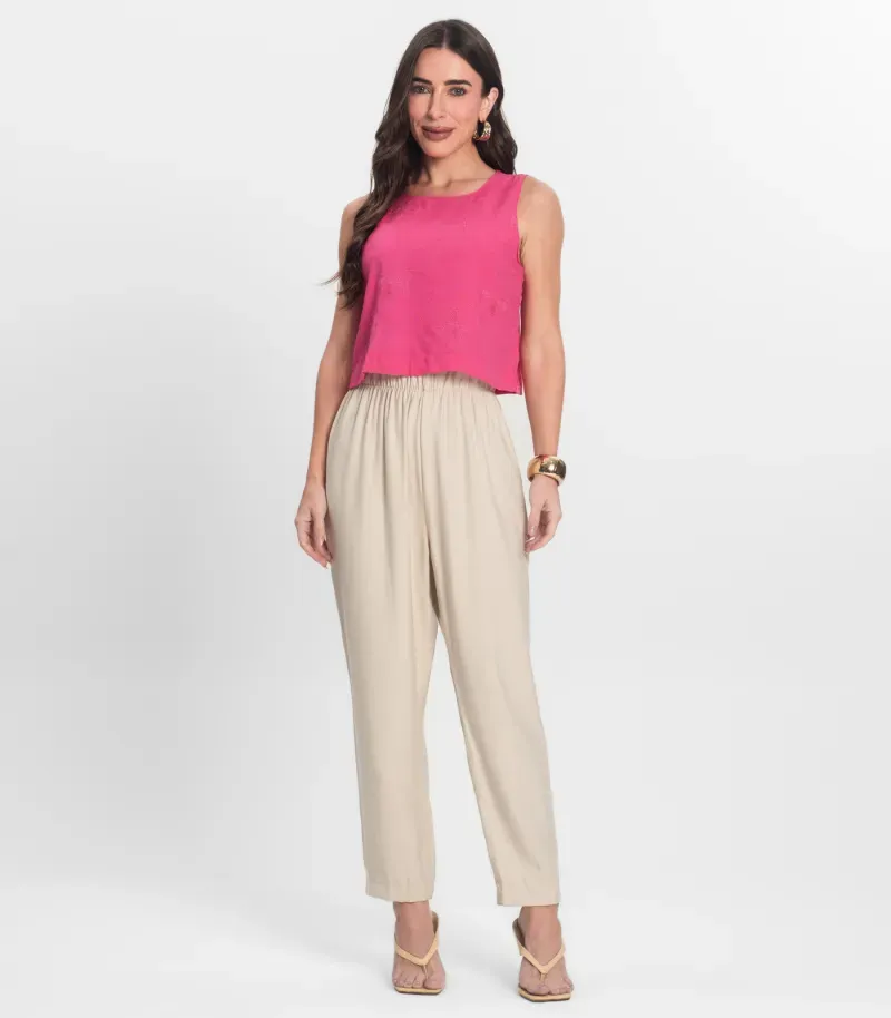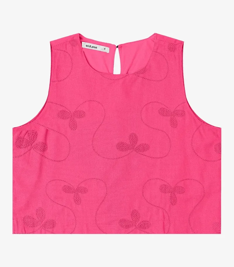 A Regata de Linho Feminina Endless combina elegância e conforto. Feita em linho bordado, possui forro embutido com pesponto de beira e uma sofisticada abertura nas costas, fechada com um botão com rabo de rato. Ideal para um look refinado e leve em qualquer ocasião.