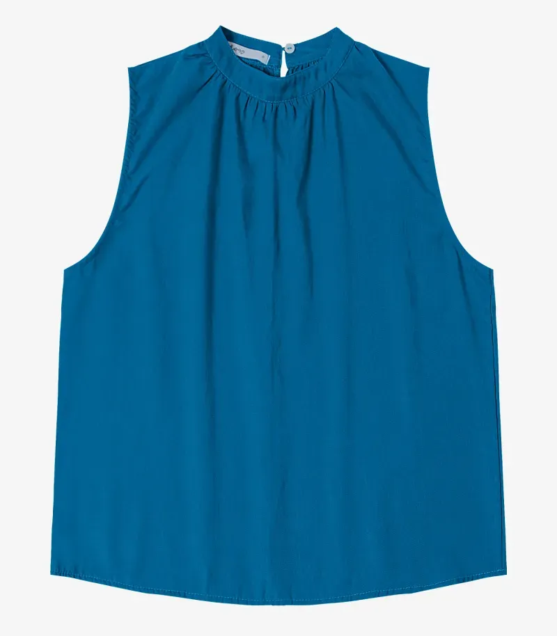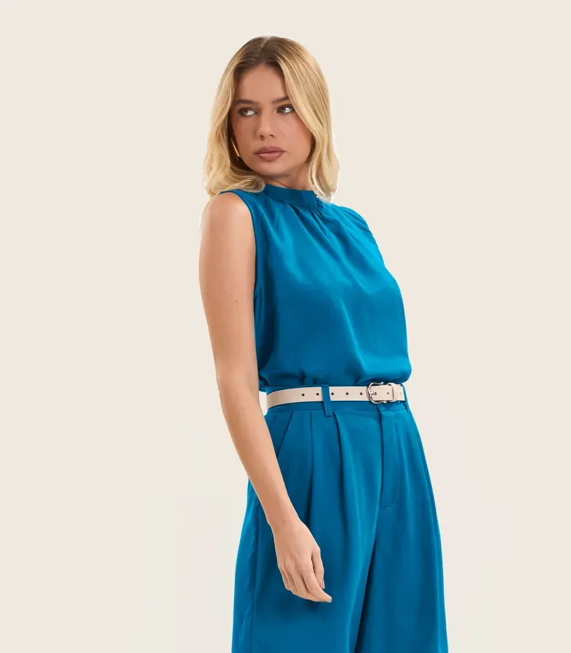A Regata Feminina Curta com Gola Endless é confeccionada em tecido tencel twill, oferecendo toque macio e caimento leve. Possui golinha dupla franzida, que adiciona charme e sofisticação ao visual. Com mangas cavadas, é ideal para dias mais quentes, garantindo frescor e estilo. A pequena abertura nas costas com fechamento por um botão traz um detalhe delicado e funcional. Perfeita para compor looks casuais ou elegantes com um toque feminino.