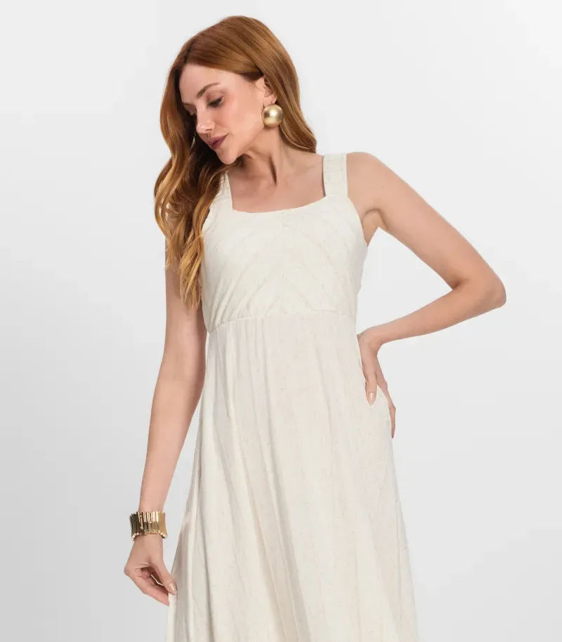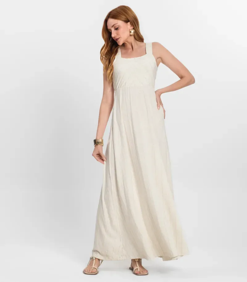 O Vestido Longo em Vicolinho Endless é a escolha perfeita para quem busca sofisticação e conforto. Confeccionado em vicolinho com lurex, o tecido leve e brilhante confere um toque de elegância à peça. O busto duplo oferece suporte, enquanto o recorte na cintura, com elástico na frente e nas costas, proporciona um ajuste impecável e valoriza a silhueta. A saia evasê com listras adiciona movimento e estilo, tornando este vestido ideal para eventos especiais ou para um look casual chic.